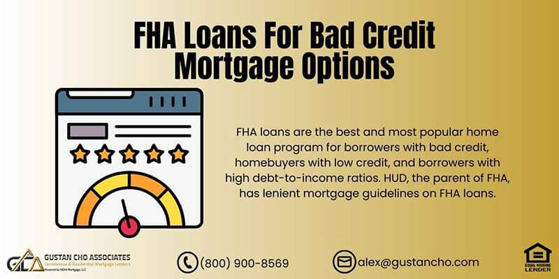 FHA loans are the best and most popular home loan program for borrowers with bad credit, homebuyers with low credit, and borrowers with high debt-to-income ratios. HUD, the parent of FHA, has lenient mortgage guidelines on FHA loans. In the following sections, we will cover FHA loans for bad credit mortgage loan options. In the following paragraphs, we will cover FHA loans for bad credit.